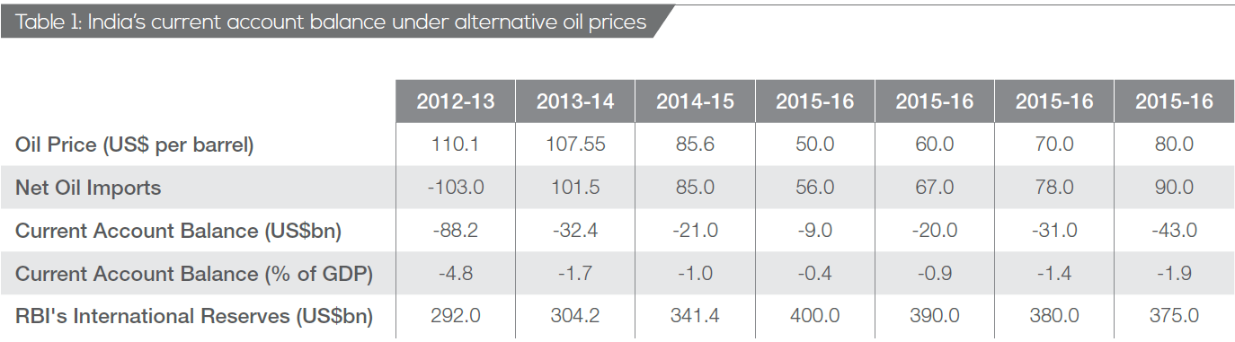 Our estimates of the FY2015-16 current account deficit under these four alternatives (see Table 1) show that the external imbalance will remain quite manageable. Even if oil prices were to average US$80 per barrel in 2015-16, India’s current account deficit would stay below 2% of GDP. In addition, the substantial build-up in international reserves that has been occurring since 2012-13 would also shield the country from shocks both from within and outside, at least for a period of time.